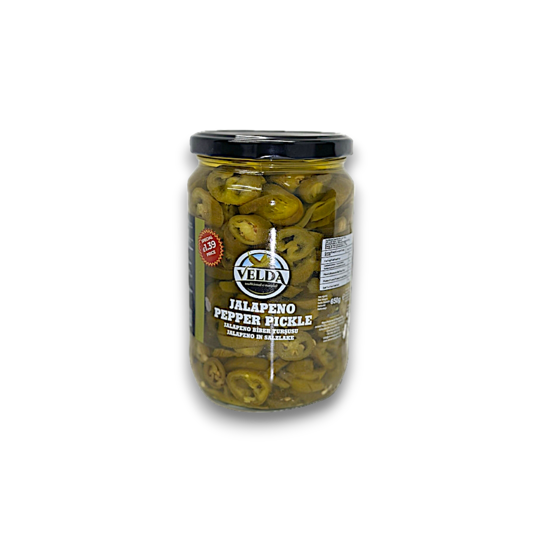 Velda Jalapeno Pickles are a flavorful and spicy condiment made from fresh jalapeno peppers. Their key features include a tangy taste, crisp texture, and a perfect balance of heat. These pickles add a zesty kick to any dish and can be enjoyed on their own or as a topping. The unique selling points of Velda Jalapeno Pickles are their handcrafted quality, made with carefully selected ingredients, and their ability to enhance the flavor profile of various foods.